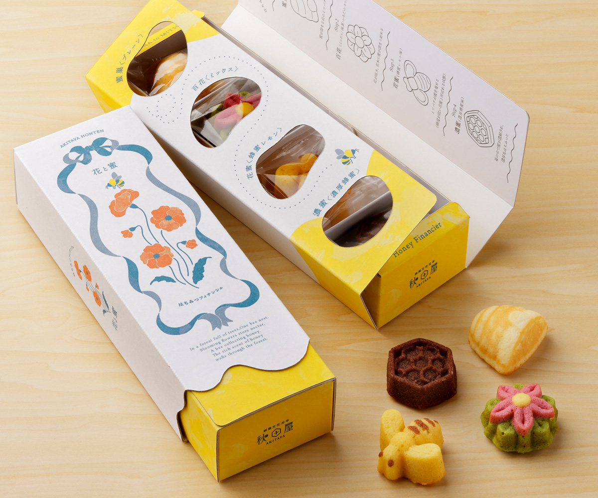 4種類のはちみつフィナンシェは各2個ずつ、 やさしいトーンのデザイン箱に入っています。 箱を開けるとそれぞれのフィナンシェが小窓から顔を覗かせ、 蓋には「はちみつが出来るまでの物語」がイラストと共に掲載されています。