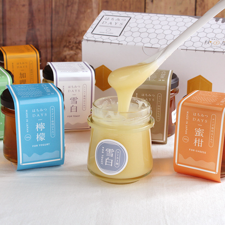 秋田屋では、純粋はちみつ、はちみつバター、フルーツなどを使ったはちみつスプレッド、ミツバチの恵みを使った健康食品、雑貨までいろいろと取り扱っています。どれを選んでいいのか迷ってしまう…