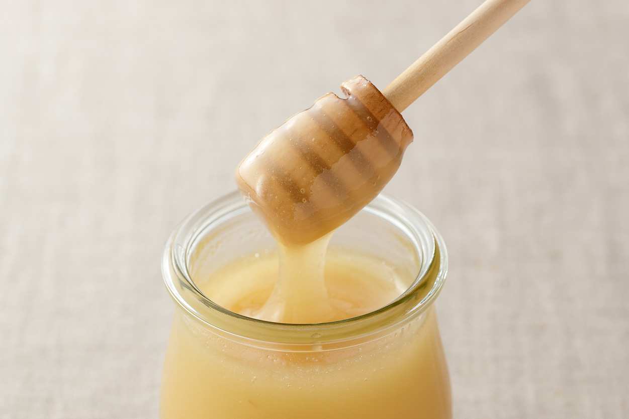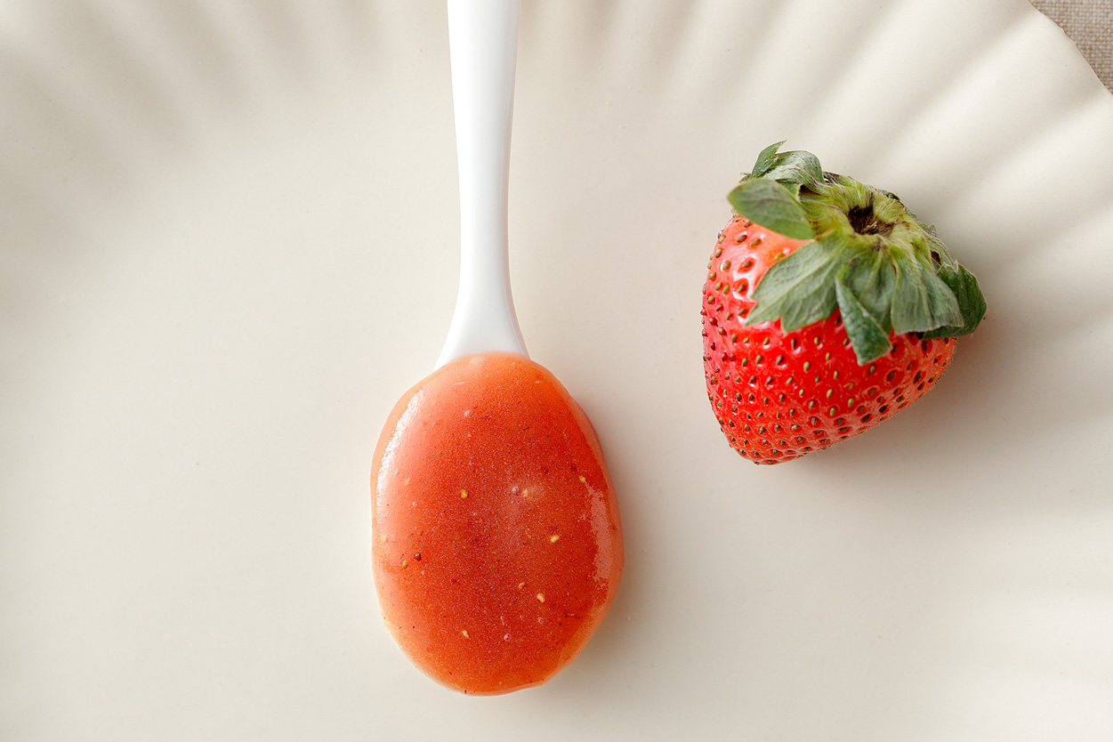 いちごへのこだわりは、粉雪のようにサラサラのパウダー状のものを使用していること。 はちみつは強い粘性があるため、他の素材と混ざりにくく、特に固形のものと混ぜようとするとうまく混ざりきらず、味にムラが出来てしまうのです。