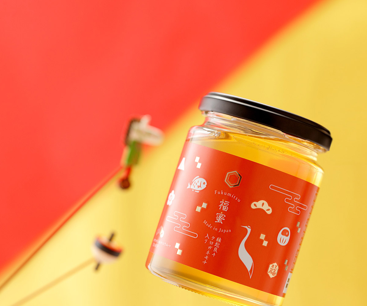 福蜜~縁起良キ クロガネモチ入り 福3つ招いて縁起良シ 笑福・・・笑顔溢れる生活の象徴・ハチミツが笑いを招く 健福・・・栄養豊富なハチミツが、健やかな日々を招く 金福・・・「苦労なくお金持ちになれる」クロガネモチが金を招く