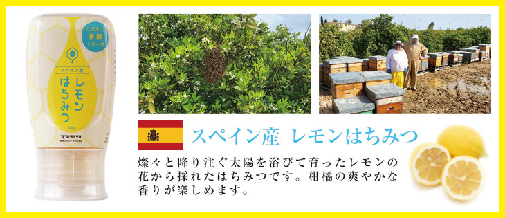 柑橘系の爽やかな香りとスッキリとした味わい。 スペインの太陽の下で育った、レモンの花から採れたはちみつです。 レモンの花は、白く小さい可憐な花ですが、おいしい蜂蜜をもたらしてくれます。 柑橘の爽やかな香りとスッキリとした味わいが特徴です。