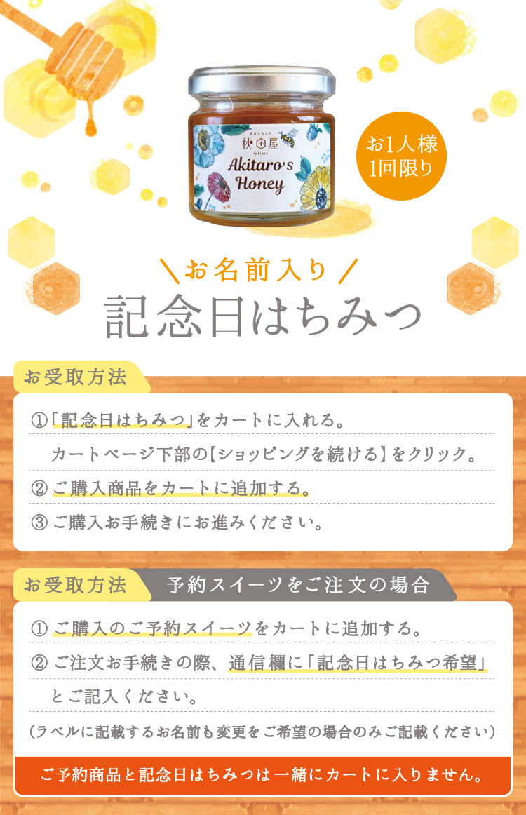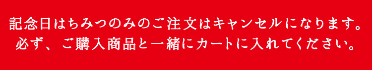 ※プレゼントのお届けは、ご自宅お届け分を含むご注文に限ります。 ※2回目のご注文で定期便をご利用の場合はご注文お手続きの際、通信欄に「記念日はちみつ希望」とご記入ください。